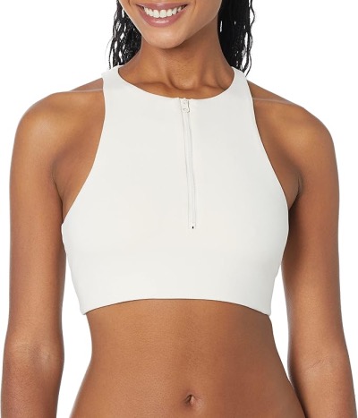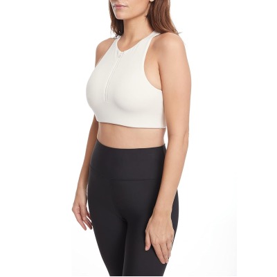 A versatile sports bra designed with a zipper front and racerback for medium support, perfect for workouts and everyday wear, combining style with comfort.